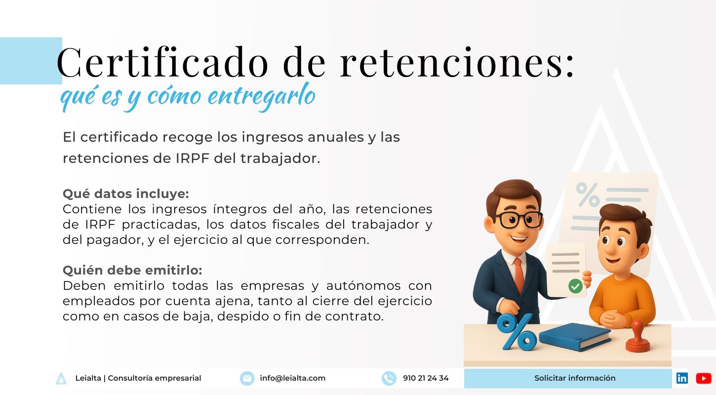 El certificado de retenciones es un documento individual que la empresa entrega a cada trabajador, donde se reflejan sus ingresos y las retenciones soportadas durante el ejercicio.