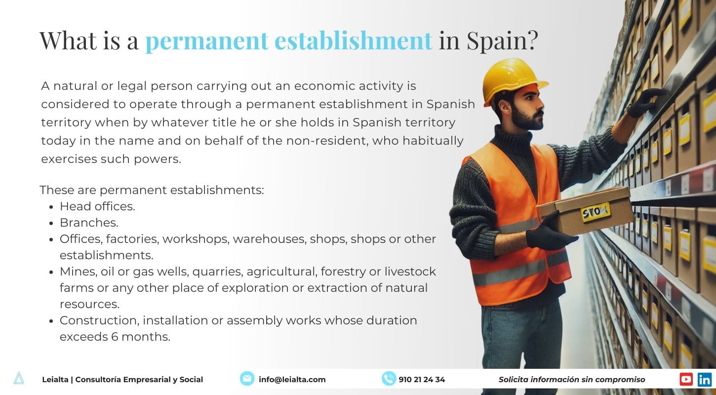 According to the Tax Agency, a natural or legal person carrying out an economic activity is considered to operate through a permanent establishment in Spanish territory when, by whatever title, it has in that territory, on a continuous or habitual basis, installations or workplaces of any kind, in which it carries out all or part of its activity or acts there through an agent authorized to contract, now in the name and on behalf of the non-resident, who habitually exercises those powers.