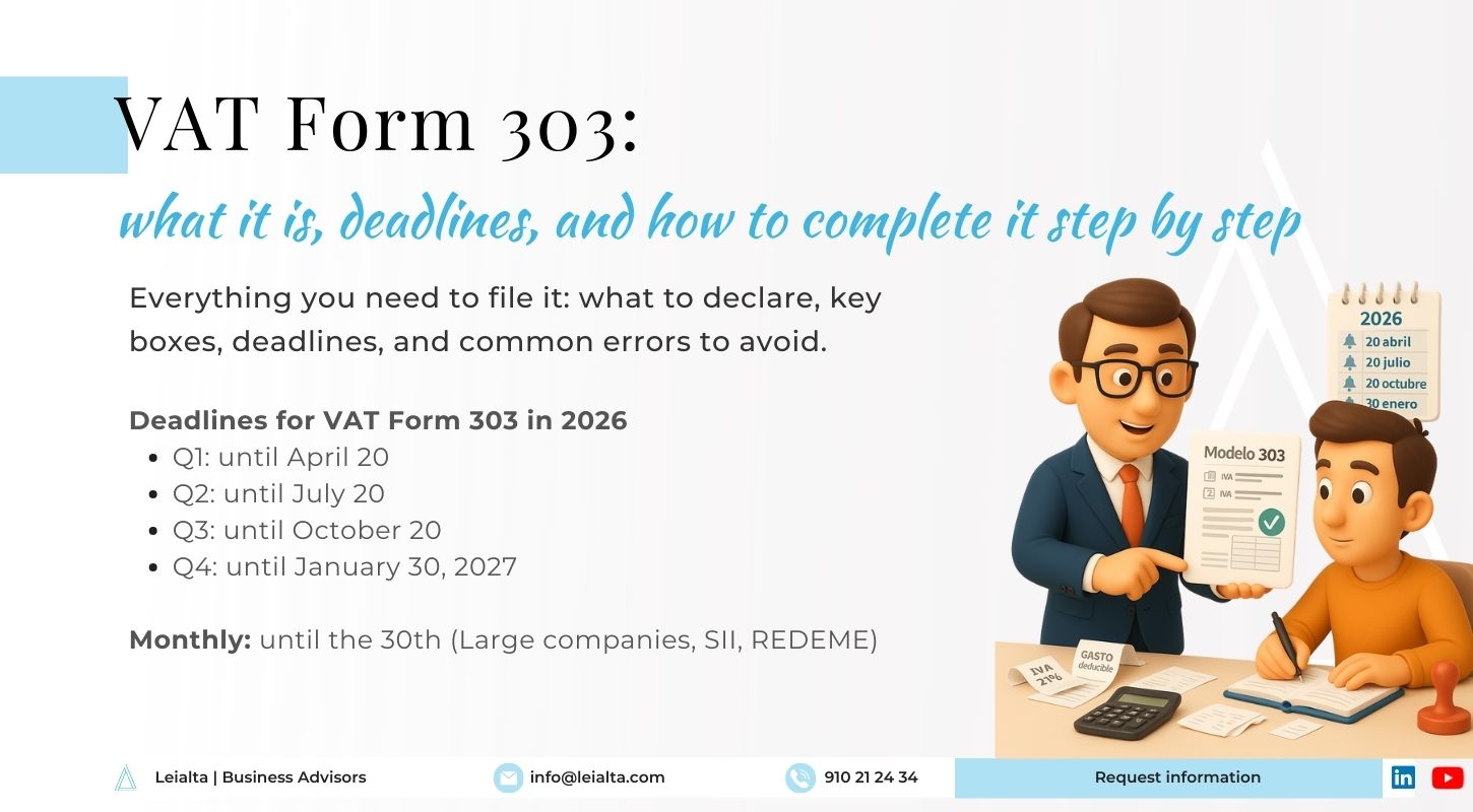 At Leialta, we work with freelancers, SMEs, subsidiaries, and business groups that need to file Form 303 for VAT securely and without errors. Our tax team reviews and classifies all transactions for the period, checks the deductibility of input VAT, and verifies that each invoice is correctly recorded in the VAT books and in the corresponding period.